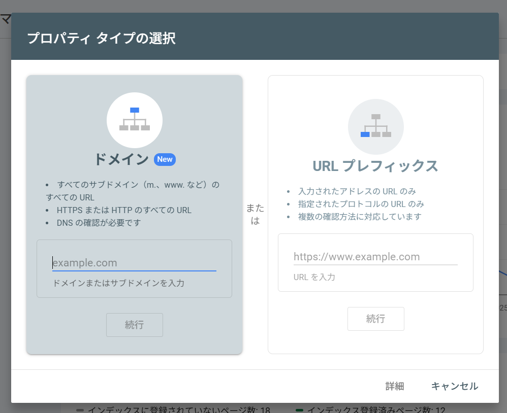 サイトを登録する画面が表示されたら、画面左側の「ドメイン」を選び、あなたのホームページのURL(https://○○○com など)を正確に入力し、「続行」をクリックします。